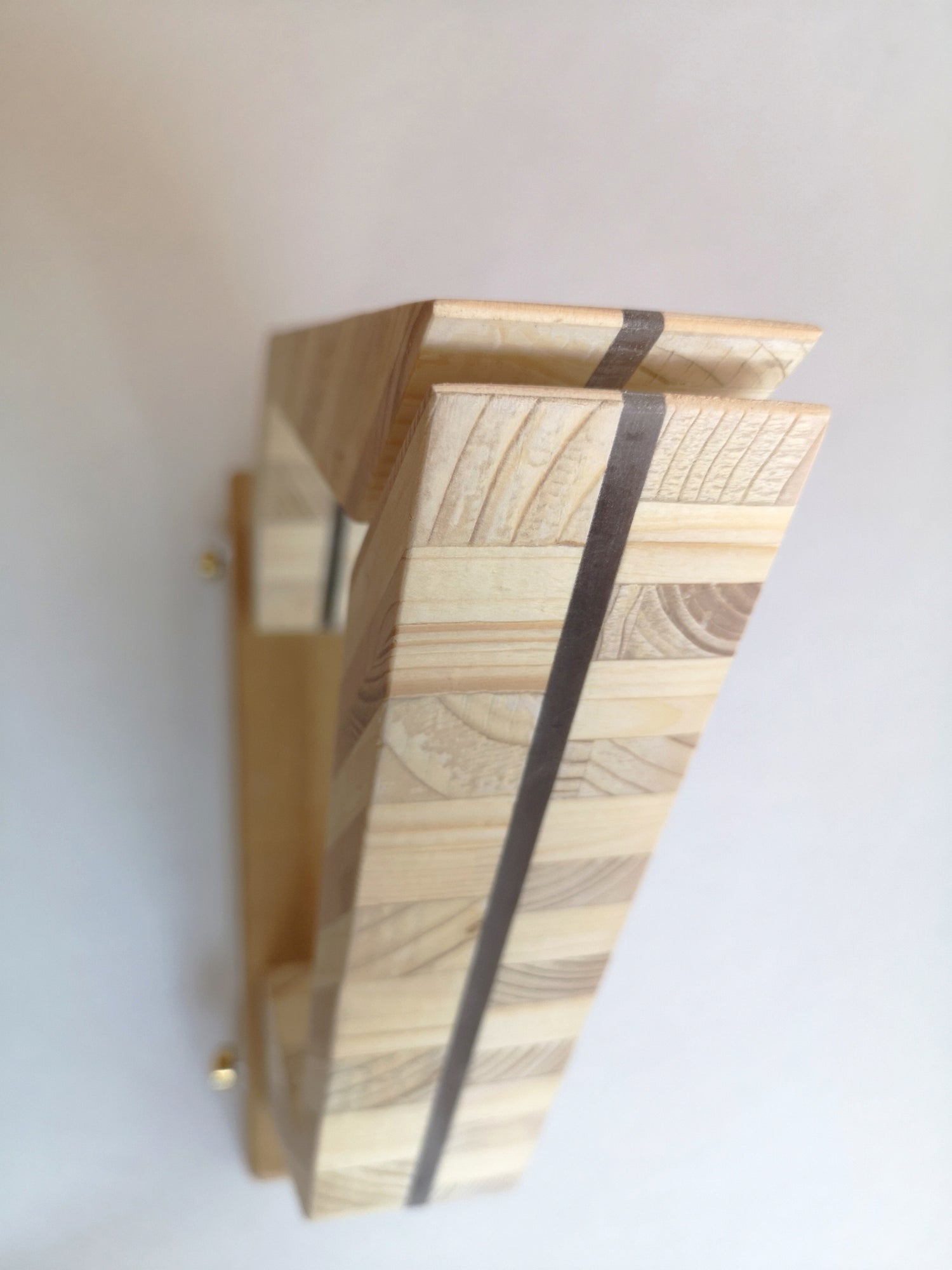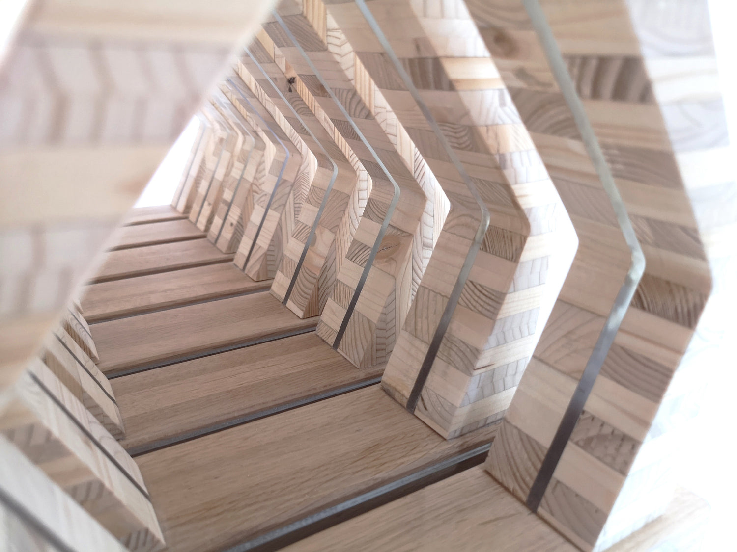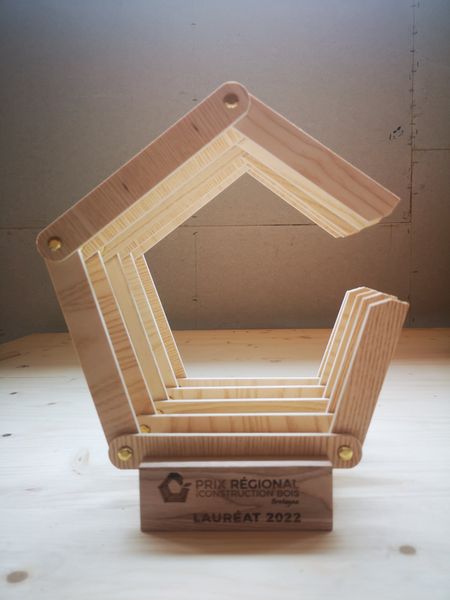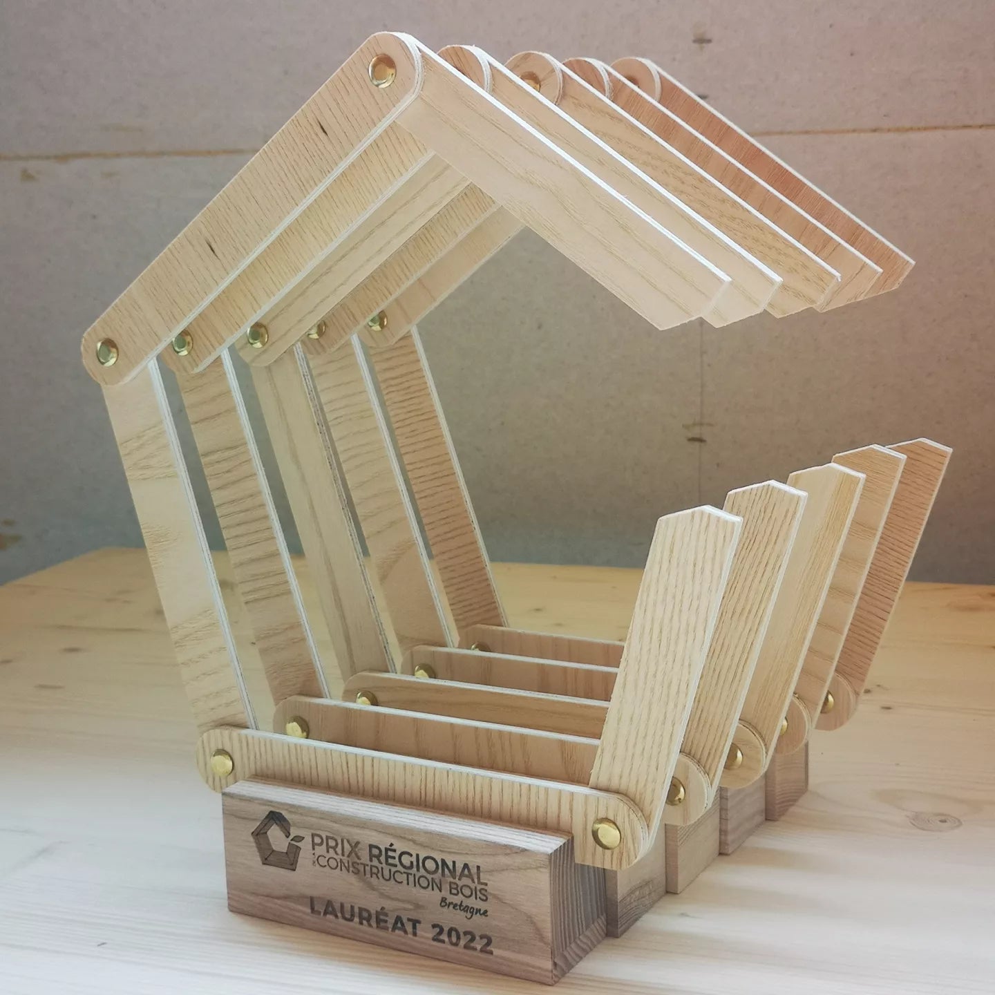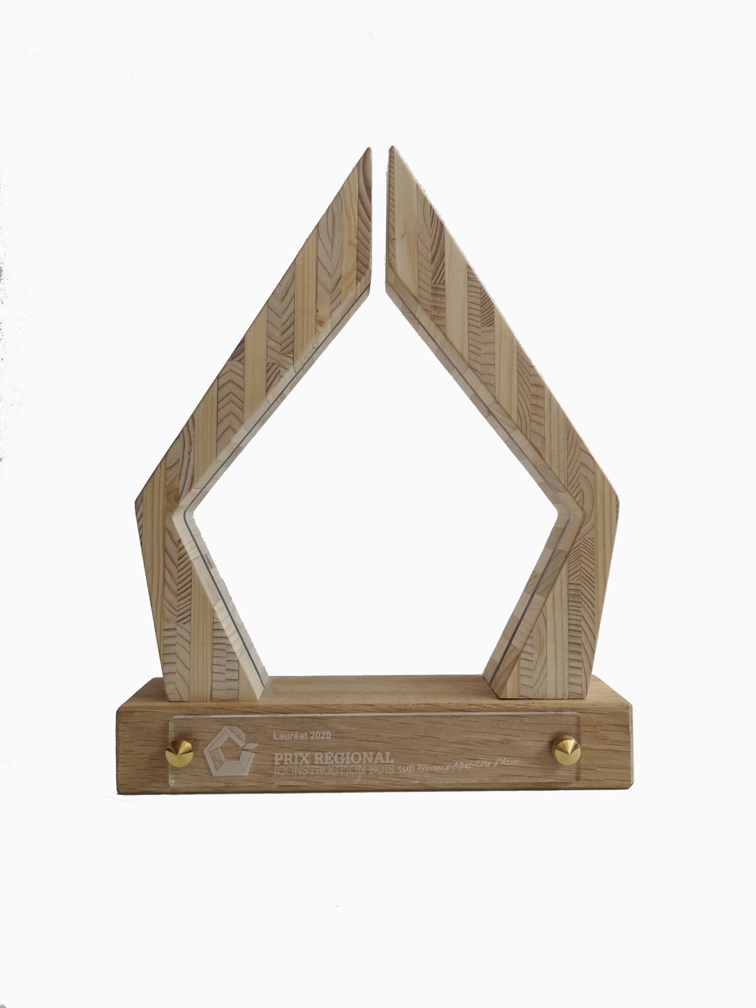 Le lamellé-collé à plis croisés, constitué de plis en bois de bout et de plis en bois de fil, offre un visuel singulier et une identité forte à ses trophées qui valorisent les métiers du bois.